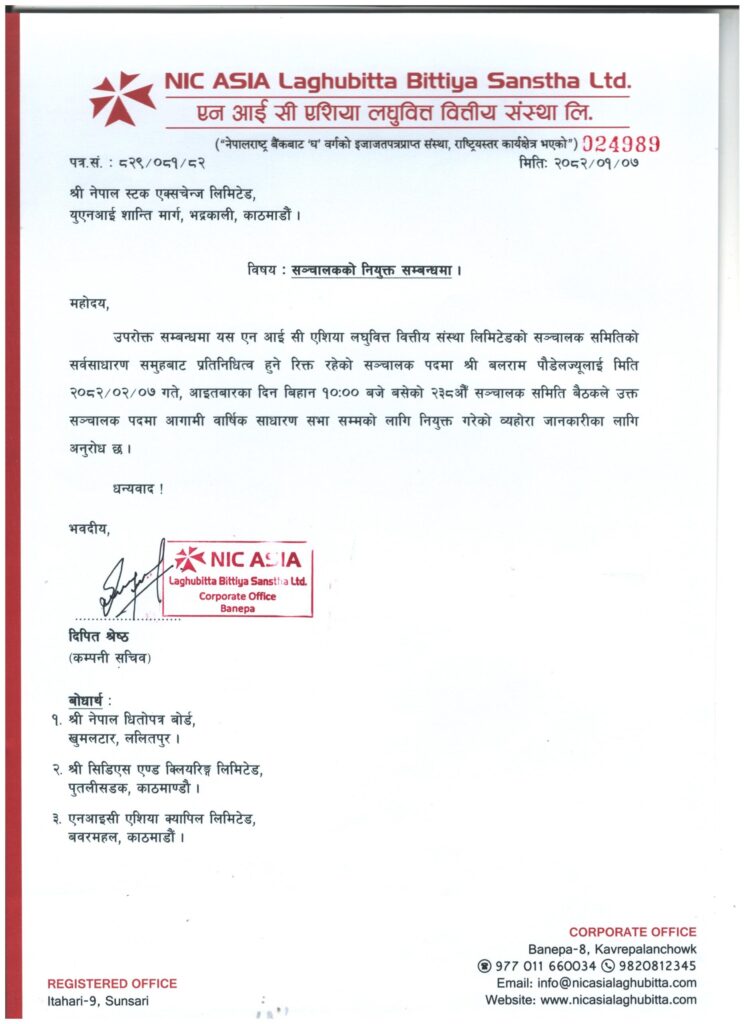 एनआइसी एशिया लघुवित्तको सञ्चालकमा पौडेल नियुक्त अर्थ विशेष | वैशाख ७ गते २०८२ काठमाडौं । एनआइसी एशिया लघुवित्त वित्तीय संस्थाको सञ्चालकमा बलराम पौडेल नियुक्त भएका छन् । संस्थाको आज वैशाख ७ गते बसेको सञ्चालक समितिको बैठकले उनलाई आगामी वार्षिक साधारण सभा सम्मका लागि नियुक्त गर्ने निर्णय गरेको हो ।