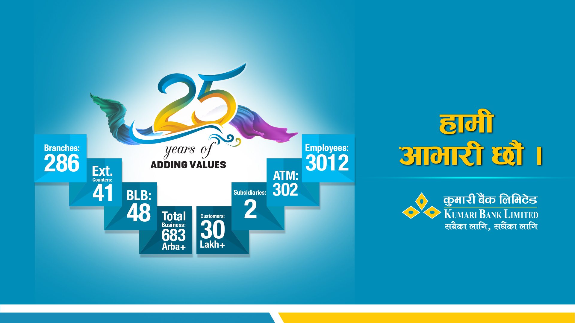 विगत २५ वर्ष देखि निरन्तर बैंकिङ्ग सेवा दिदै आएको कुमारी बैंकले आफ्ना देशभर रहेका २८६ शाखा सञ्जाल, ३०२ एटिएम, ४१ एक्सटेन्सन काउन्टर तथा ४८ शाखा रहित बैंकिङ्ग ईकाईहरु मार्फत आफ्ना तिस लाखभन्दा बढि ग्राहकवर्गहरुलाई अत्याधुनिक तथा प्रभावकारी सेवाहरु प्रदान गर्दै आइरहेको छ र आगामी दिनहरुमा पनि अझ सरल, सुलभ तथा उत्कृष्ट सेवाका निमित्त सहकार्यहरु गर्दै जाने समेत प्रतिबद्धता जनाएको छ ।