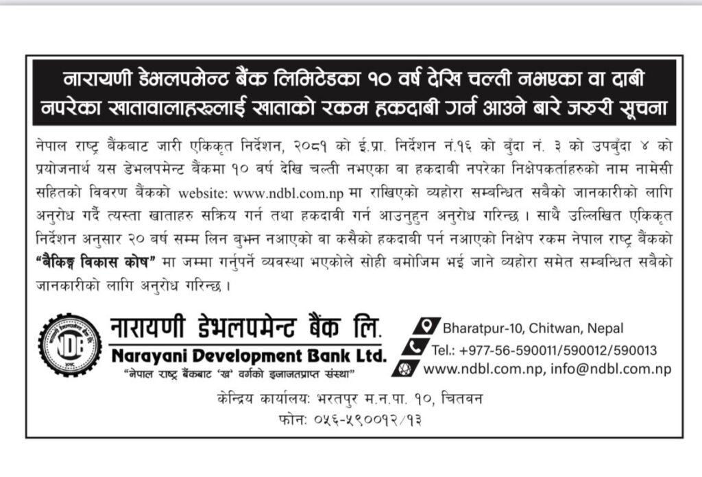 नारायणी डेभलपमेन्ट बैंकले सम्बन्धित खाताधनीलाई थप जानकारीका लागि बैंकको वेबसाइट वा केन्द्रीय कार्यालय, भरतपुर–१० चितवनमा सम्पर्क गर्न आग्रह गरेको छ ।