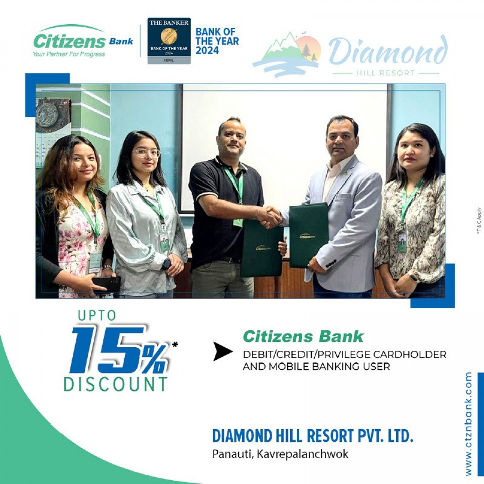सिटिजन्स बैंकका ग्राहकले डायमण्ड हिल रिसोर्टमा विशेष छुट पाउने