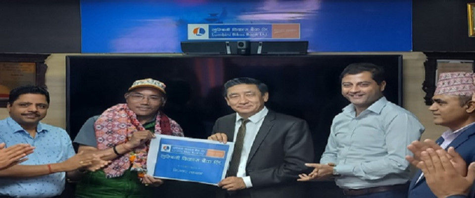 लुम्बिनी विकास बैंकद्वारा किर्तिमानी पर्वतारोही शेर्पालाई बैंकको लोगो अंकित ब्यानर हस्तान्तरण