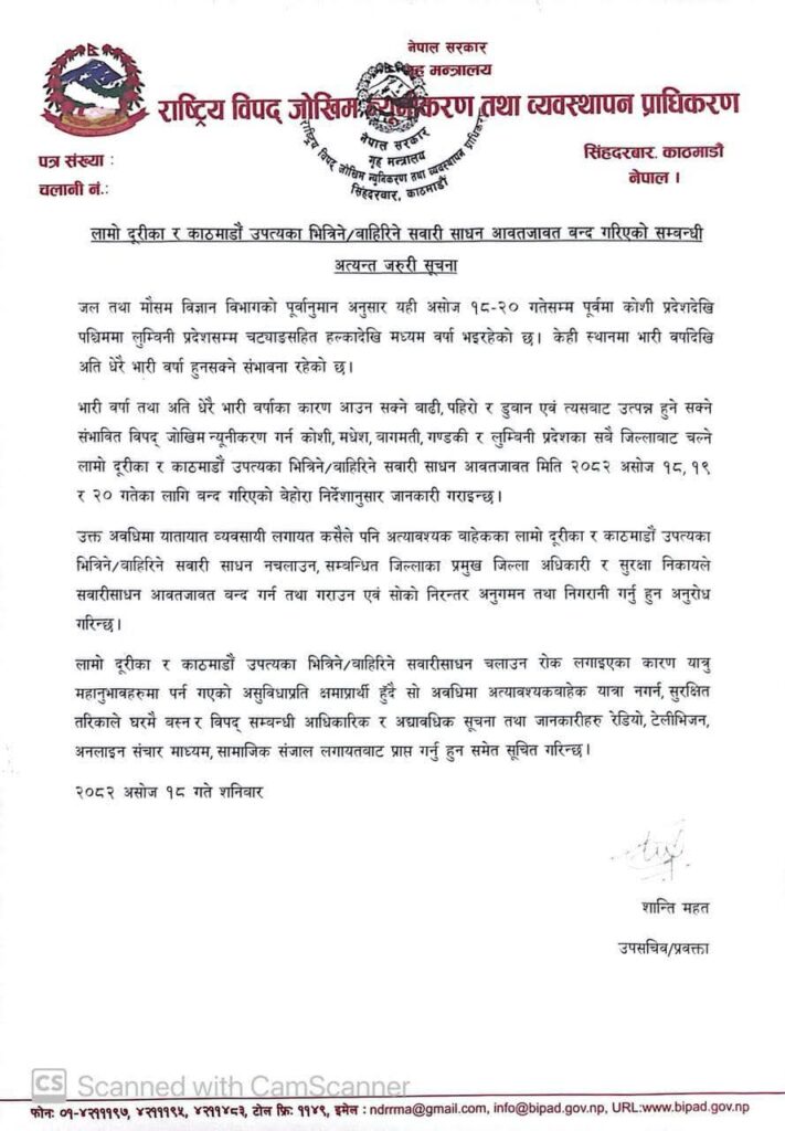 काठमाडौं । राष्ट्रिय विपद् जोखिम न्यूनीकरण तथा व्यवस्थापन प्राधिकरणले लामो दूरीका र काठमाडौं उपत्यका भित्रिने तथा यहाँबाट बाहिरिने सवारी साधन आगामी तीन दिनसम्म सञ्चालन नगर्न सम्बद्ध सबैपक्षसँग आग्रह गरेको छ ।