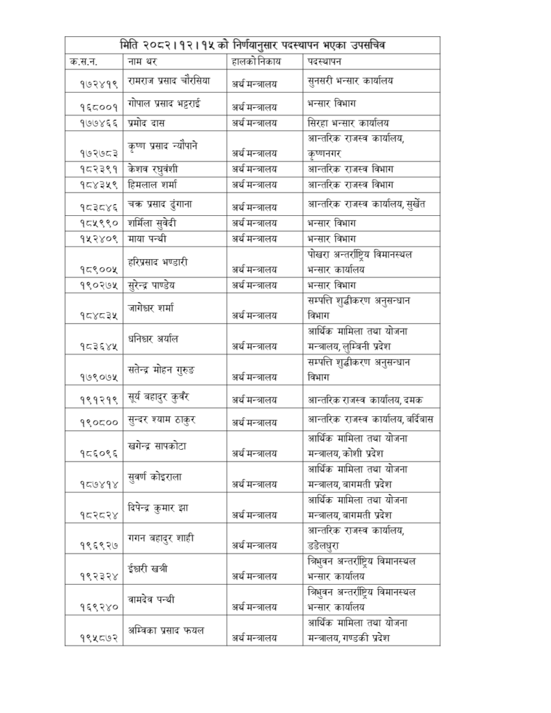 अर्थमन्त्रालयका अनुसार अर्थमन्त्रालयमा रहेर विभिन्न जिम्मेवारीमा रहेका ३० जना कर्मचारीलाई अर्थमन्त्रालबाट अर्थमन्त्रालय मातहतका कार्यालयमा सरुवा गरिएको हो ।