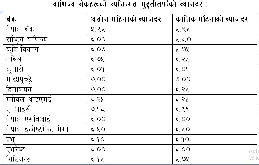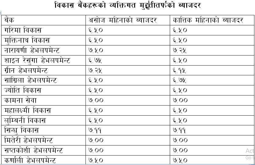 विकास बैंकतर्फ कातिक महिनाका लागि ३ वटा बैंकहरूले व्यक्तिगत मुद्दतीतर्फको ब्याजदरमा केही कटौती गरेका छन् भने अधिकांश विकास बैंकहरूले ब्याजदर स्थिर राखेका छन् । तर, सांग्रिला विकास बैंकले भने असोज महिनाको तुलनामा कात्तिक महिनाको लागि ब्याजदर वृद्धि गरेको छ ।