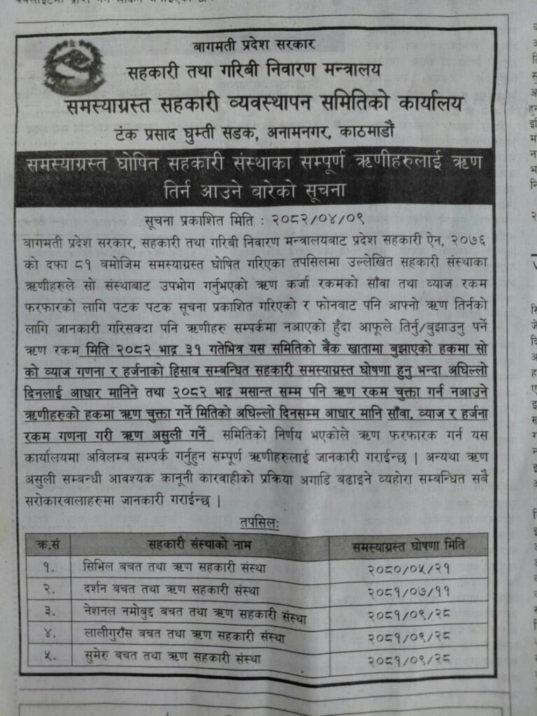 काठमाडौं। बागमती प्रदेश सरकारअन्तर्गतको समस्याग्रस्त सहकारी व्यवस्थान समितिको कार्यालयले बागमती प्रदेशभित्रका पाँचवटा समस्याग्रस्त सहकारीका ऋणीलाई आगामी भदौ मसान्तसम्म ऋण चुक्ता गर्न ताकेता गरेको छ ।