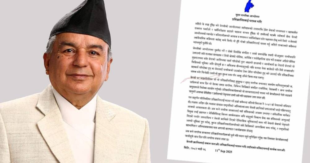 काठमाडौं । बृहत् नागरिक आन्दोलनले संविधानका संरक्षक राष्ट्रपतिको अभिभावकत्वमा ‘जेनजी’ क्रान्तिको सफलताको बाटो पहिल्याउनु आजको आवश्यकता भएको ठहर गरेको छ । आन्दोलनले आज विज्ञप्ति जारी गर्दै राष्ट्रपतिको सहभागिता र अभिभावकत्वमा मात्रै वर्तमान राजनीतिक परिस्थितिको निकास खोज्ने काम गर्न आग्रह गरेको छ ।
